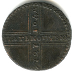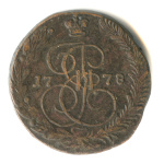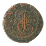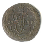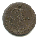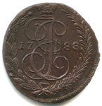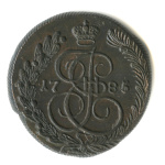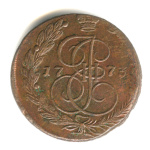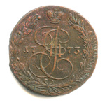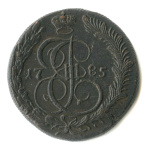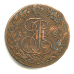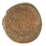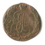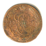 5 копеек — Вензель императрицы Екатерины II Великой. Орел 1780 г. Екатеринбург 1785 ЕМ. особый орёл — «широкие шеи», легковесные — 41,7 гр