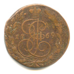 5 копеек — Вензель императрицы Екатерины II Великой. Орел 1768 г. Екатеринбург 1769 ЕМ