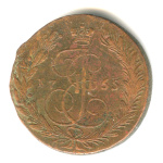 5 копеек — Вензель императрицы Екатерины II Великой. Орел 1763 г. Екатеринбург 1765 ЕМ