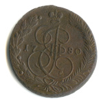 5 копеек — Вензель императрицы Екатерины II Великой. Орел 1780 г. Екатеринбург 1780 ЕМ