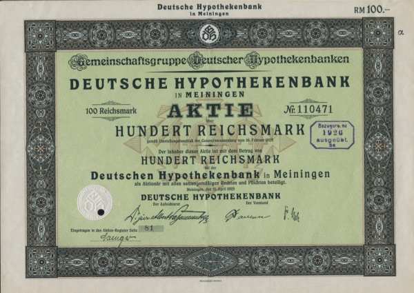 Дивидендная акция на предъявителя номиналом в 100 немецких рейхсмарок 1920 (Германия)