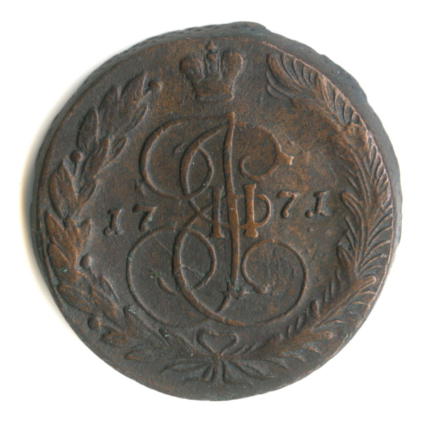 5 копеек — Вензель императрицы Екатерины II Великой. Орел 1768 г. Екатеринбург 1771 ЕМ (Российская Империя)