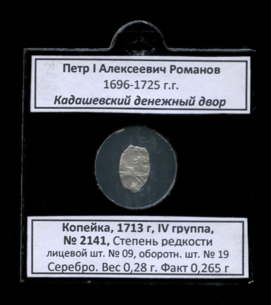 Копейка 1713. В холдере. Пётр I Алексеевич Романов (1696−1725 гг.), Кадашевский денежный двор, IV группа, № 2141, Степень редкости лицевой шт. № 09, о…