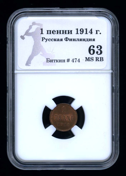 1 пенни — Для Финляндии. Вензель Николая II 1914. В оригинальном сертифицированном слабе® MS RВ 63 - (Российская Империя)