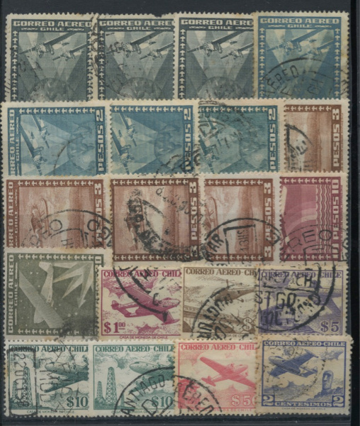 Лот почтовых марок. 1930-е. Чили. Авиапочта. Пейзажи. Местные авиалинии. Самолеты. Гашёные. Отличное состояние. 20 шт 1930−е (Чили)