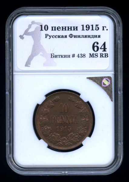 10 пенни — Для Финляндии. Вензель Николая II 1915. В оригинальном сертифицированном слабе® MS RB 64 - (Российская Империя)