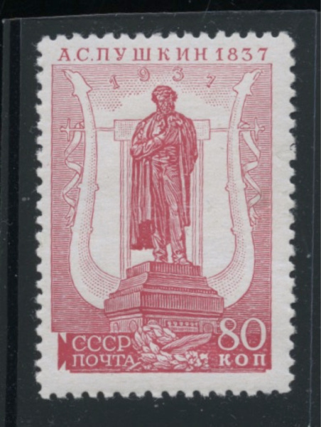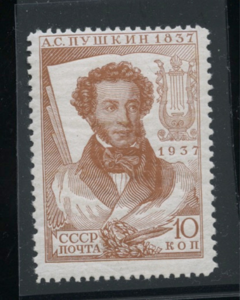 Марка почтовая. Чистая. Без наклеек и следов.100 лет со дня смерти Пушкина 1937 г. Загорский 445CSP, А Ка Перф. лин 13 ¾:12 ¼ Точка в О в слове ПОЧТА…