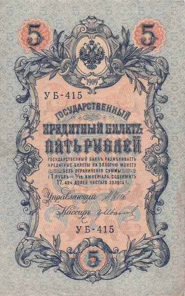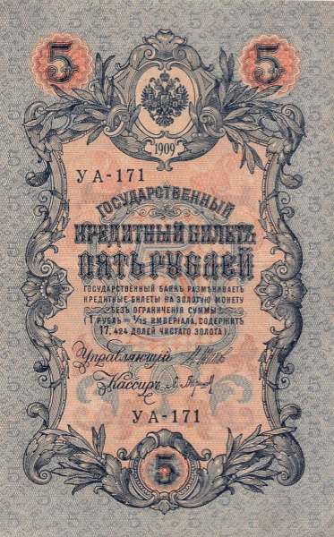 5 рублей — упр. Шипов. Барышев 1909 - (Российская Империя)