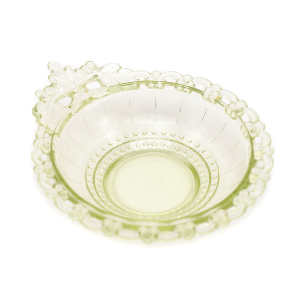 Розетка из десертного сервиза «Ажурный» в зеленом оттенке, автор Н. Тарковская, стекло, Стекольный завод имени Первого коммунистического добровольческ…