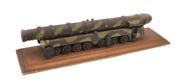Сувенирный макет самоходной пусковой установки на базе специального колесного шасси МАЗ-7917 «Тополь». Размер 40×10 см