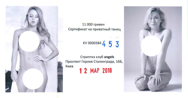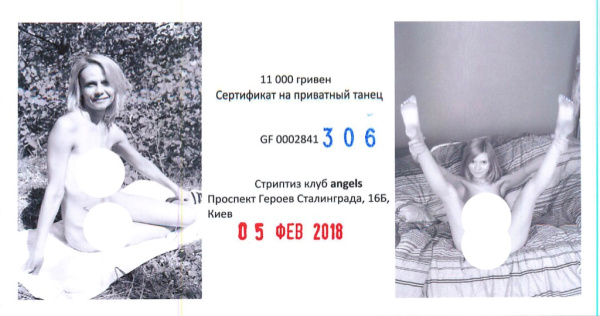 11 000 гривен Стриптиз клуб «Angels» Сертификат на приватный танец 2018 (Украина)