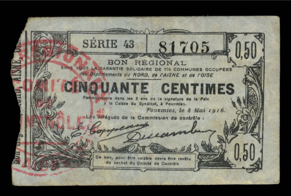 50 сантимов — Региональный бон. Деньги чрезвычайных обстоятельств. Северные регионы Франции. Первая мировая война 1916 (Франция)