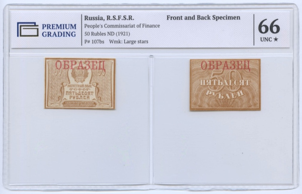 50 рублей 1921. В слабе. Образец. Редкость. В слабе PREMIUM GRADING 66 Unc (РСФСР)