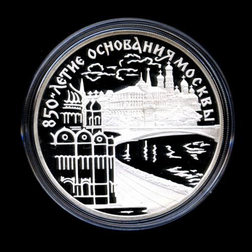 3 рубля — 850-летие основания Москвы (набережная) — В капсуле, с сертификатом. Банковская сохранность монеты 1997 ЛМД (Россия)