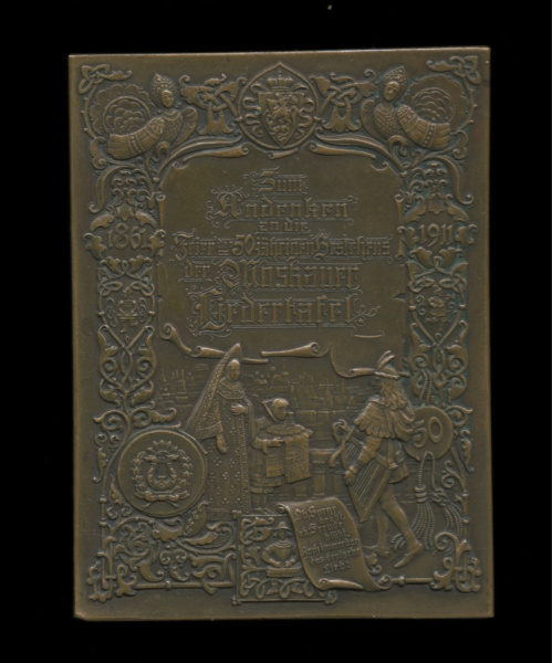 Плакета в память 50-летнего юбилея Московского Общества квартетного пения «Лидертафель». Штутгарт, фирма «Mayer & Wilhelm», 1911 г. Медальер К. Шефер.…