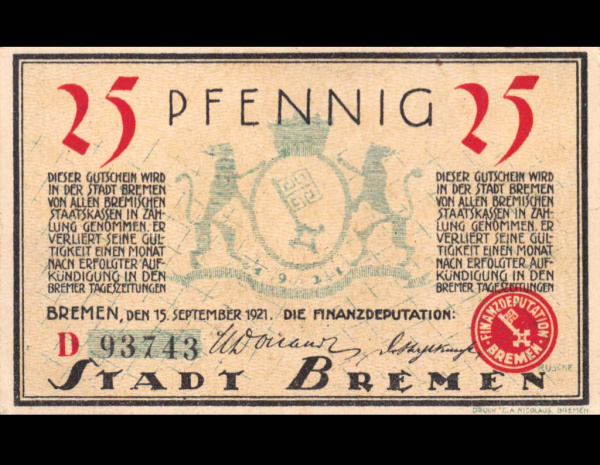 25 пфеннигов — Бремен 1921. Экземпляр из крупной коллекции мирового уровня (Германия (Нотгельды))