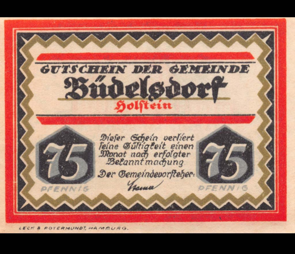75 пфеннигов — Бюдельсдорф 1920. Экземпляр из крупной коллекции мирового уровня (Германия (Нотгельды))