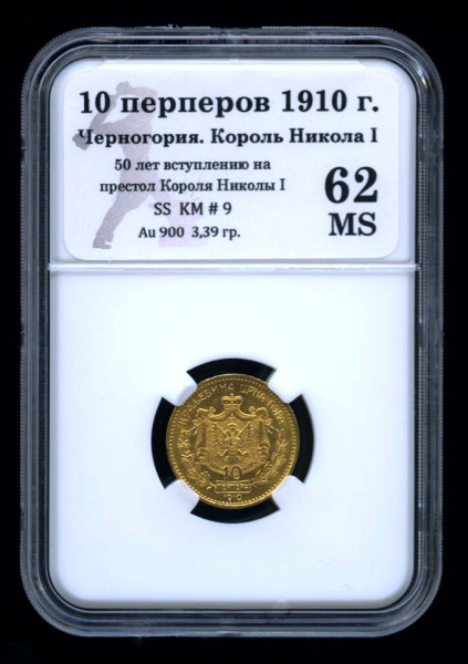10 перперов — 50 лет вступлению на престол Короля Николы I (Юбилейная монета) 1910. В Слабе® MS 62 (Черногория)