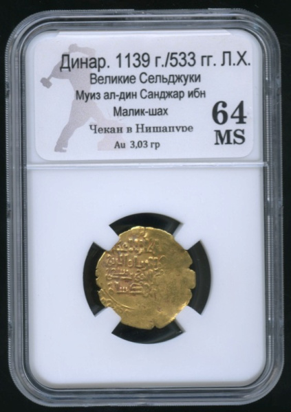 динар 1139 год. В слабе. Великие Сельджуки. (533 год Хиджры). Санджар ибн Малик. Монетный двор — Нишапур. В слабе MS 64 (Монголия)