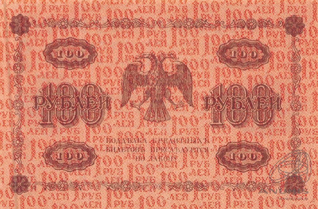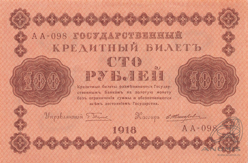Банкнота регулярного выпуска: 100 рублей 1918 года «упр. Пятаков. Жихарев». Государственные Кредитные Билеты 1918 г. Российская Империя/РСФСР: Гражданская война (1917 — 1923).