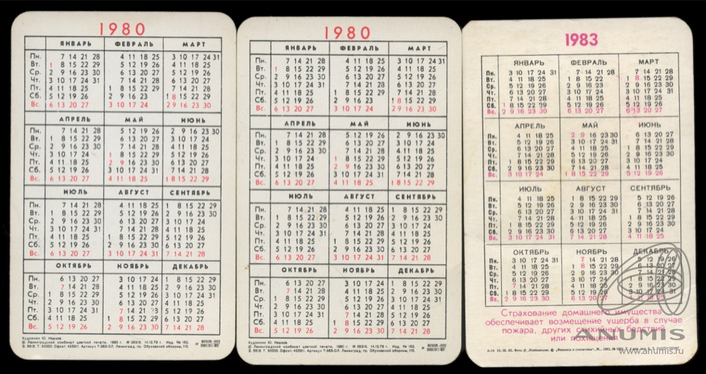 Лот карманных календариков «Олимпиада-80. Страхование домашнего имущества». 3 шт