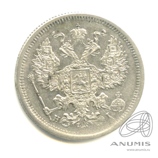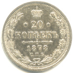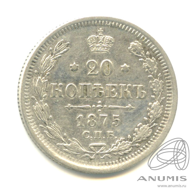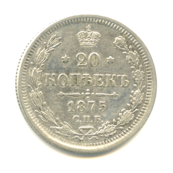 Монета регулярного выпуска: 20 копеек 1875 года «Орел 4 типа». 20 копеек 1859 — 1917 гг. Российская Империя: Александр II (1855 — 1881). Монетный двор: Санкт-Петербургский монетный двор, г. Санкт-Петербург. Серебро 500, 4 г, ø 22 мм, Гурт: Рубчатый. Тираж: 14545003 шт.