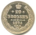 В центре указан номинал — «20», ограниченный с обеих сторон шестиконечными звездочками. Над цифрой — Корона Российской империи. Под цифрой номинала — слово «КОПЕЕК». Ниже, расположен декоративный разделитель в виде двух разнонаправленных фигурных линий и стилизованным из точек крестом между ними. Под разделителем — дата выпуска монеты «1875». Под цифрой даты — обозначение монетного двора «С.П.Б.». Вдоль канта, не доходя до короны, изображен венок из лавровой и дубовой ветви, которые, в нижней части, перевязаны лентой на узел бантом. По окружности канта имеются рельефные элементы, выполненные в виде зубцов.