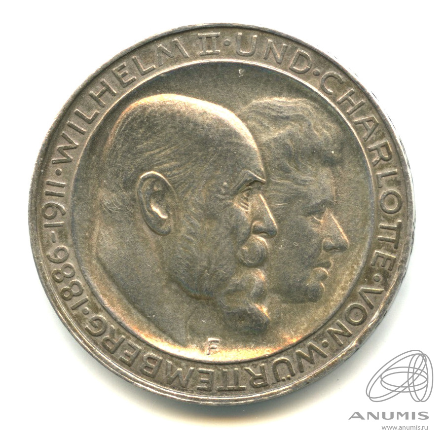 Юбилейная монета «3 марки 1911 года «25 лет свадьбе Вильгельма II и Шарлотты /обычная буква «Н» в «Charlotte"/»»
