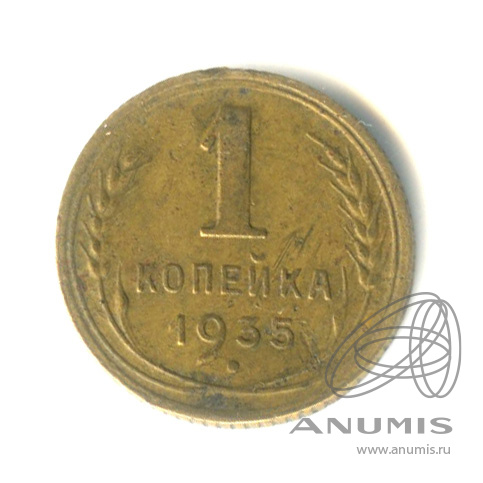 Монета регулярного выпуска: 1 копейка 1935 года «Без круговой надписи. Венок 7 лент». 1 копейка 1935 — 1936 гг. Союз Советских Социалистических Республик: СССР ранний (1924 — 1958). Бронза, 1 г, ø 15 мм, Гурт: Рубчатый. Тираж: 66405000(ст.инов.тип) шт.