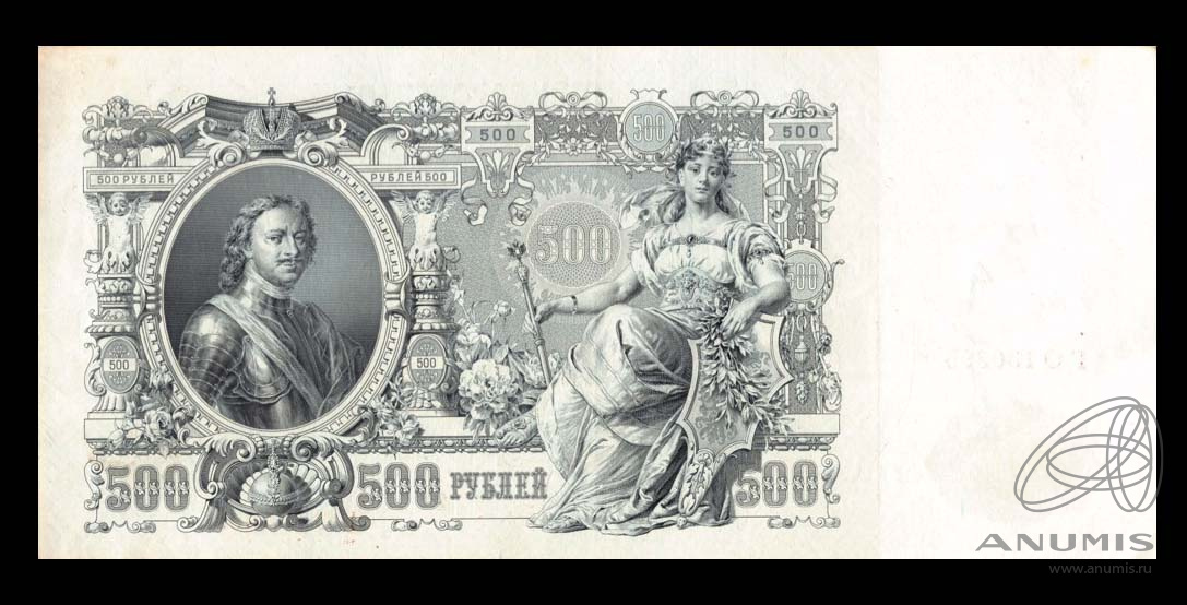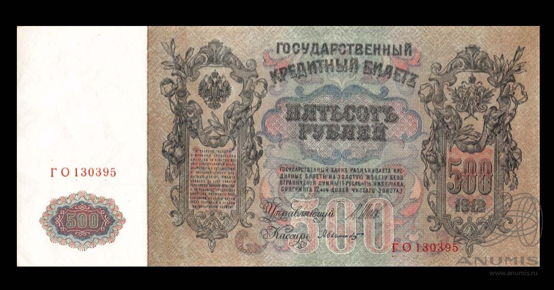 Банкнота регулярного выпуска: 500 рублей 1912 года «упр. Шипов. Былинский». Государственные Кредитные Билеты 1898 — 1912 гг. И.П. Шипов. Российская Империя: Николай II (1894 — 1917).