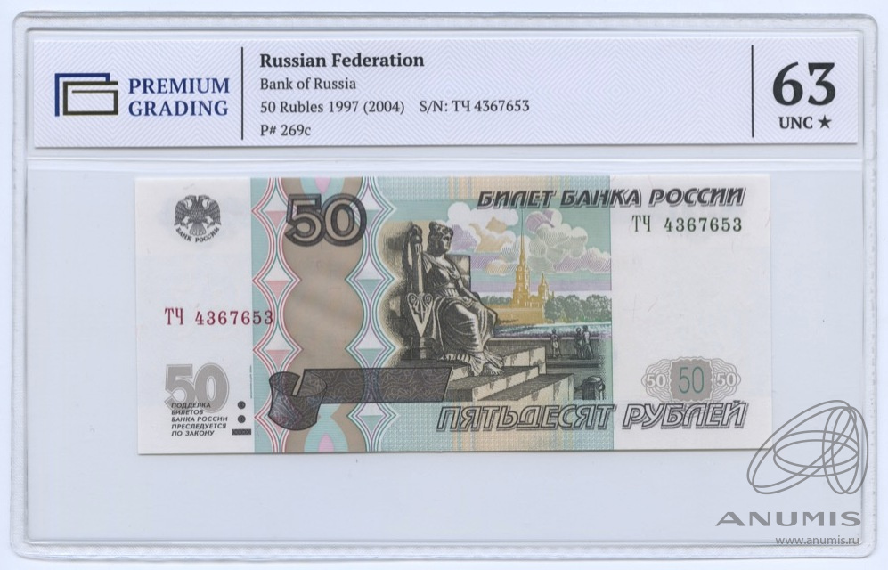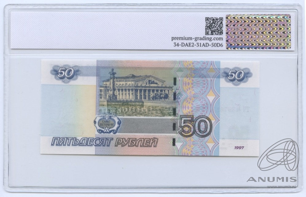 50 рублей (Pick: # 269c) 1997. В слабе. В слабе PREMIUM GRADING 63 Unc. Модификация 2004 года
