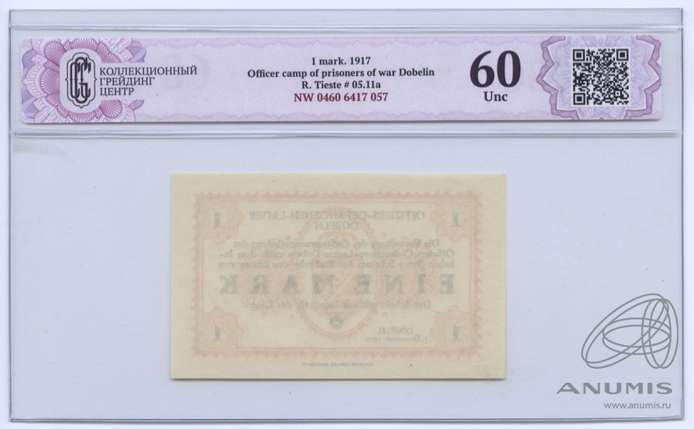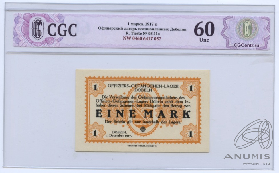 1 марка Лагерь для военнопленных Добелин 1917. В слабе. В слабе CGC 60