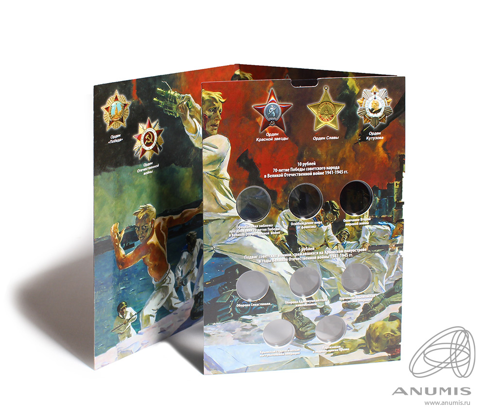 Предназначен для хранения 8 монет номиналом 5 и 10 рублей, посвященных 70-летию Победы советского народа в Великой Отечественной войне 1941−145 годов и подвигу советских воинов, сражавшихся на Крымском полуострове.