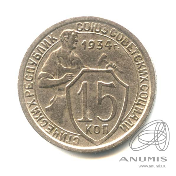 Монета регулярного выпуска: 15 копеек 1934 года «Со щитом». 15 копеек 1931 — 1934 гг. Союз Советских Социалистических Республик: СССР ранний (1924 — 1958). Медь-никель, 3 г, ø 20 мм, Гурт: Рубчатый. Тираж: 58367000 шт.