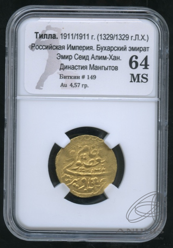 Тилла 1911. В слабе. (1329 год Хиджры) Бухарский эмират. Эмир Сейд Алимхан. Слаб MS64