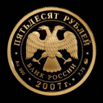 в центре — эмблема Банка России (двуглавый орёл с опущенными крыльями, под ним — надпись полукругом «БАНК РОССИИ»), обрамленная кругом из точек и надписями по кругу — вверху: «ПЯТЬДЕСЯТ РУБЛЕЙ», внизу: слева — обозначения драгоценного металла и пробы сплава, в центре — дата выпуска «2007 г.», справа — содержание химически чистого металла и товарный знак монетного двора.