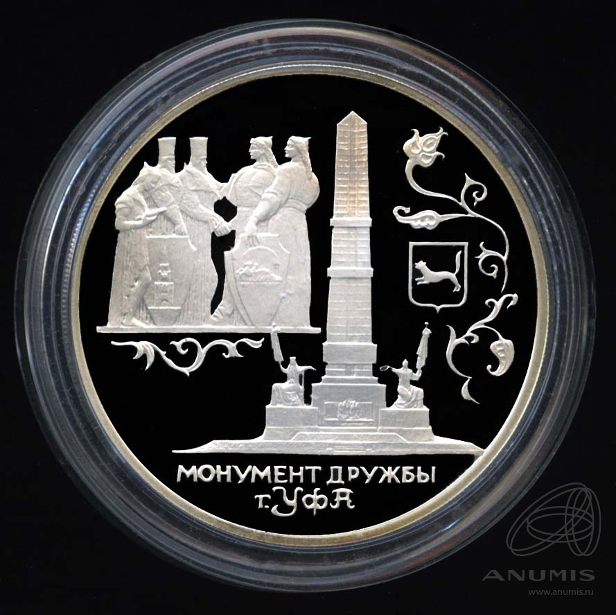 Юбилейная монета: 3 рубля 1999 года «Монумент дружбы. Уфа». Памятники архитектуры России. Российская Федерация: Россия современная (1997 — 2020). Монетный двор: Санкт-Петербургский монетный Двор. Серебро 900, 34 г, ø 39 мм, Гурт: Рубчатый. Тираж: 3000 шт. Серия: Памятники архитектуры России.