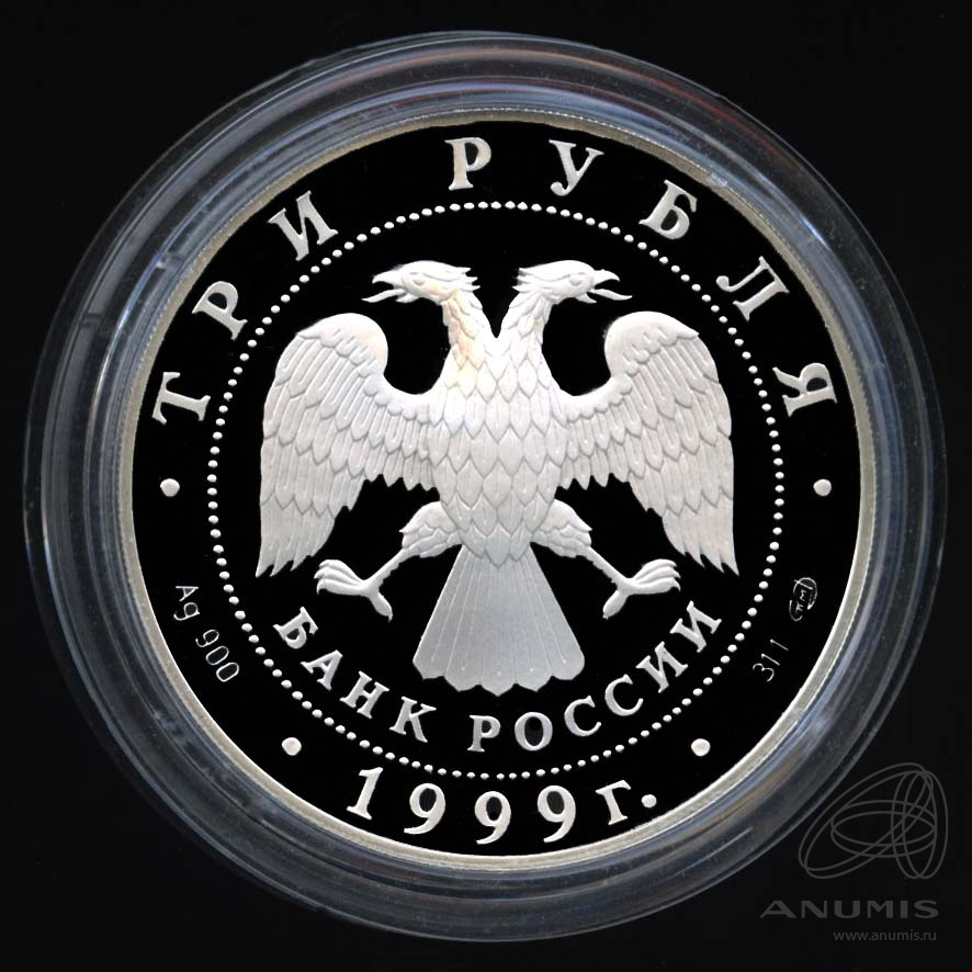 в центре диска — эмблема Банка России (двуглавый орёл художника И. Билибина, под ним надпись полукругом «БАНК РОССИИ»), обрамлённая кругом из точек и надписями по кругу: вверху — «ТРИ РУБЛЯ», внизу — «1999 г.», слева — обозначение металла, проба сплава, справа — содержание драгоценного металла в чистоте и товарный знак монетного двора.